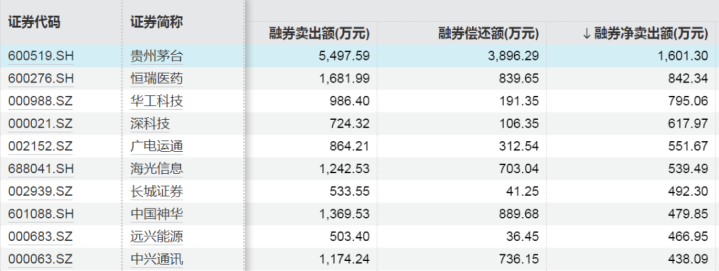 上周融券净卖出额居前的股票为贵州茅台、恒瑞医药、华工科技,分别为1601.30万元、842.34万元、795.06万元。