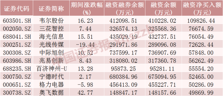 从个股情况来看,上周融资客对138只股票加仓金额超1亿元,加仓居前的10只股票分别为韦尔股份、三花智控、海光信息、光线传媒、中际旭创、兆易创新、百济神州-U、宁德时代、格力电器、奥飞数据,分别净买入10.98亿元、7.67亿元、7.61亿元、7.26亿元、5.78亿元、5.63亿元、5.56亿元、5.25亿元、5.03亿元、4.99亿元。从市场表现上看,上周融资客加仓居前十的股票涨多跌少,跌幅最大的光线传媒跌逾19%,涨幅最大的奥飞数据涨逾42%。