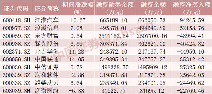 上周融资净卖出金额前十股