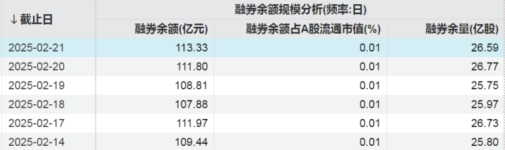 Wind数据显示,截至2月21日,A股市场融券余额为113.33亿元,上周融券余额增加3.89亿元,融券余量为26.59亿股。